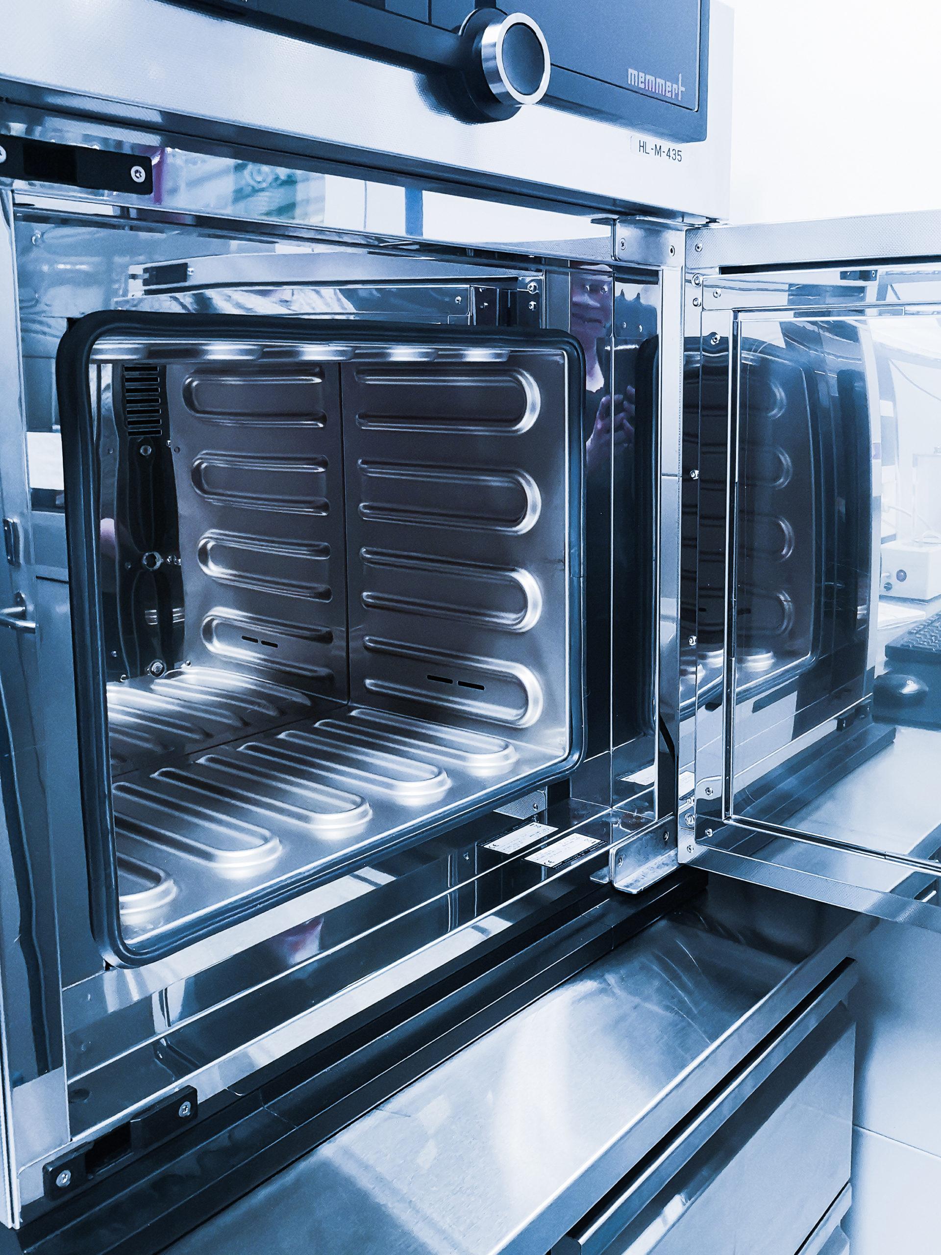 - After the over has warmed, the petri dishes with the membranes inside are put to into the oven. The dishes are heated in the oven. The lids of the petri dishes are opened slightly to allow the moisture to evaporate from the membranes.